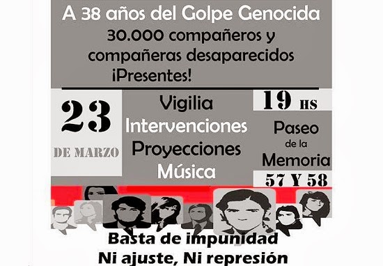 El domingo 23 de Marzo desde las 18 hs realizaremos una VIGILIA en el Paseo de la Memoria( 57 y Avda 58) en la cual se desarrollaran diversas actividades como; Radio Abierta, participación de bandas y artistas locales, pintadas alusivas y otras intervenciones urbanas alusivas.