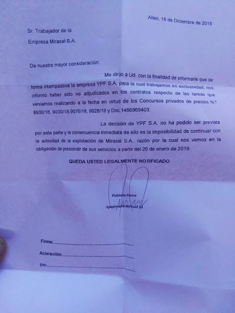 La misma informó por medio de telegramas que prescindía de los servicios de cada trabajador debido a que en forma intempestiva YPF notificó la no adjudicación de los contratos de explotación de gas que realizaba en 5 zonas del área Estación Fernández Oro desde 2017. La rescisión de los contratos se hará vigente desde el 20 de enero de 2019.