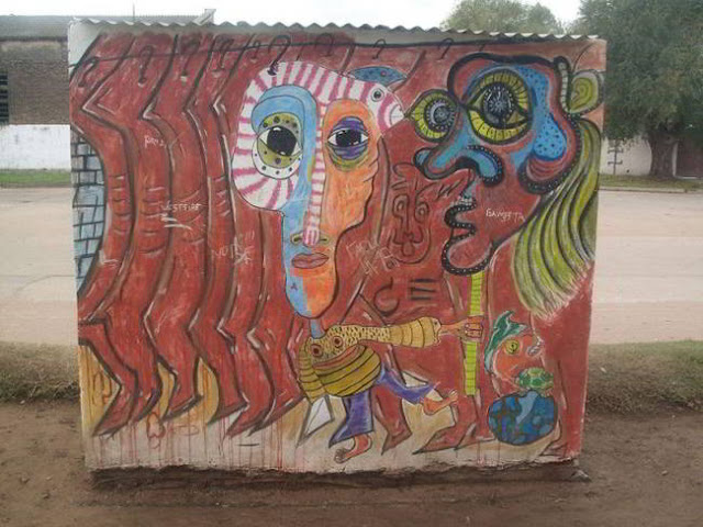 Empezamos a andar todo el día juntos porque éramos vecinos. Y nos hicimos amigos. Éramos un grupo de varios que nos juntábamos a dibujar y a pintar en esos primeros momentos. Se fue afianzando la amistad y empezamos a hacer más cosas, como pintar murales. Fuimos a 25 de Mayo y pintamos la casa de un amigo de él, la muraleamos entera. También una garita de colectivo que estaba frente a un matadero en esa ciudad, pintamos unas vacas colgando como si fueran medias reses medias extrañas, como haciendo una crítica a la industria y el mercado de la carne que mata sin considerar. Siempre eran murales de ese tipo, como una crítica al sistema. En parque Saavedra de La Plata pintamos un hombre pájaro volando, donde luego lo taparon con una propaganda del intendente Bruera. También hicimos construcciones naturales, hasta casas de barro.