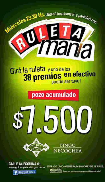 MAÑANA, Miércoles 13 de mayo a partir de las 23.30 hs, Bingo Golden Palace continúa con la exitosa Promo “Ruletamanía”, en donde se pondrán en juego más de $ 7.500 en premios en efectivo.