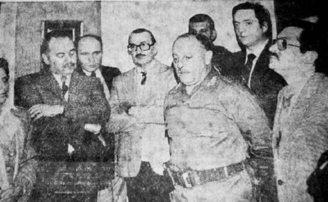 Hoy, a seis años de su partida, es un buen momento para contar cuándo y por qué fue tomada esa foto, algo que sus difusores no dicen, ya sea porque no lo saben o porque no quieren. La imagen es del 6 de abril de 1982. Ese día, representantes de las fuerzas políticas y sociales de la capital provincial se reunieron para manifestar su apoyo a la recuperación de las islas Malvinas, que se había producido cuatro días antes. La foto corresponde a ese encuentro.