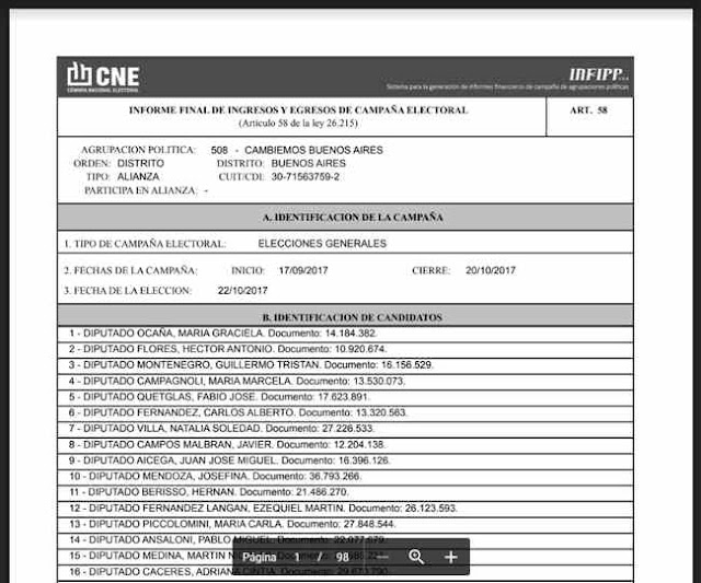 A continuación, se resaltaron los 467 nombres correspondientes a falsos aportantes de campaña que declaró la alianza Cambiemos en su informe ante la Justicia Electoral. Es necesario destacar que la gran mayoría se repiten en las elecciones Primarias categoría Diputado y Senador, y en las generales también: