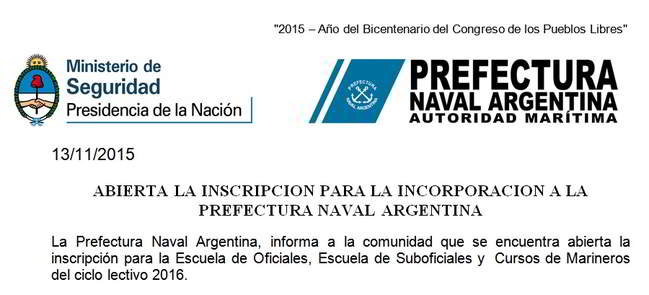 La Prefectura Naval Argentina, informa a la comunidad que se encuentra abierta la inscripción para la Escuela de Oficiales, Escuela de Suboficiales y Cursos de Marineros del ciclo lectivo 2016.