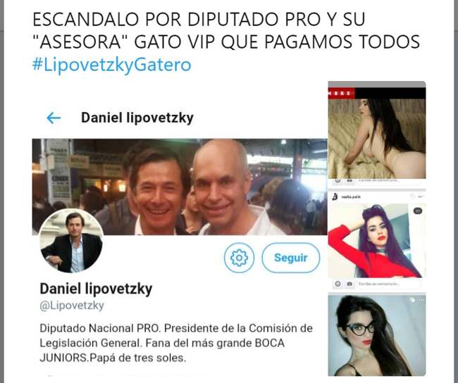 ESCANDALO POR DIPUTADO PRO Y SU «ASESORA» GATO VIP QUE PAGAMOS TODOS#LipovetzkyGatero pic.twitter.com/enLseXgRPF— INFO EN PROCESO (@INFOENPROCESO) 31 de mayo de 2018