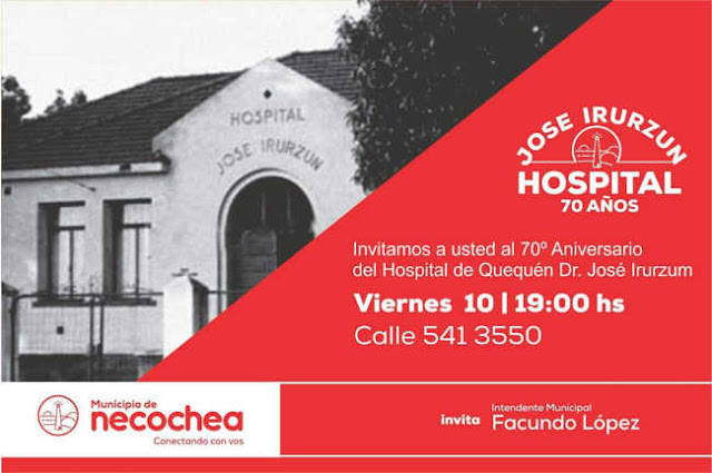 La Municipalidad de Necochea, a través de su intendente Dr. Facundo López, invita a la comunidad a participar, el próximo viernes 10 desde la hora 19, del acto por el 70º aniversario del Hospital Irurzun de Quequén, ubicado en calle 541 Nº 3550 de la vecina localidad.