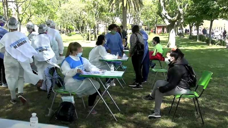 En la Plaza “Hipólito Yrigoyen”, al igual que en el día de ayer, estuvieron entrevistando a los vecinos un cuerpo de voluntarios conformado por miembros de los equipos sanitarios del municipio y de la Provincia, además de un equipo de promotores de Salud del programa “El barrio cuida al barrio”, que se encuentran realizando trabajo en territorio desde algunas semanas.