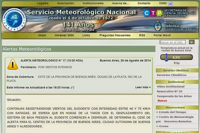 CONTINUAN REGISTRANDOSE VIENTOS DEL SUDOESTE CON INTENSIDAD ENTRE 40 Y 75 KM/H CON RAFAGAS. SE ESPERA QUE EN HORAS DE LA TARDE CON EL DESPLAZAMIENTO DEL SISTEMA DE BAJA PRESION AL SUDESTE COMIENCEN A DISMINUIR. SE DETERMINA EL CESE DE ALERTA PARA EL CENTRO DE LA PROVINCIA DE BUENOS AIRES, CIUDAD AUTONOMA DE BUENOS AIRES Y ALREDEDORES.