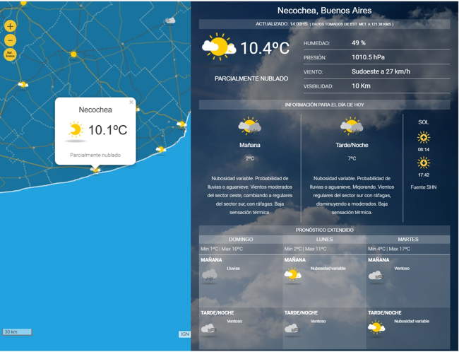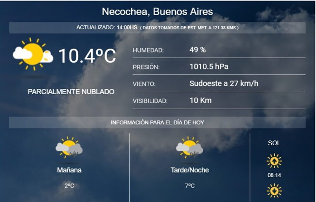 El desplazamiento de un frente frío a través del área de cobertura provocará un cambio gradual de los vientos al sector sur con velocidades estimadas entre 40 y 70 km/h, con ráfagas.