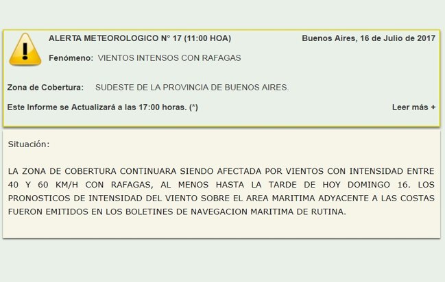 Según informa el Servicio Meteorológico Nacional, hay un alerta por vientos intensos con ráfagas para este domingo en toda la zona del sudeste de la provincia.