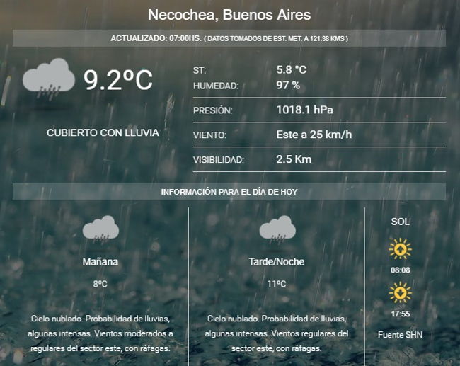 El Servicio Meteorológico Nacional emitió un alerta de vientos fuertes y precipitaciones intensas para el sur y sudeste de la provincia de Buenos Aires. La temperatura, no supera los 11 grados.