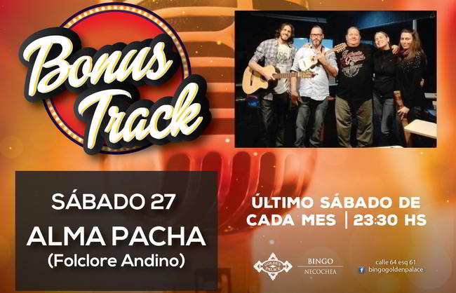 Hoy sábado, a partir de las 23:30hs, se presenta por primera vez en el escenario de Bingo Golden Palace un grupo folclórico que no podés dejar de conocer.: Alma Pacha. Y si ya los viste, y sabés de lo que hablamos… vení a disfrutarlos nuevamente!