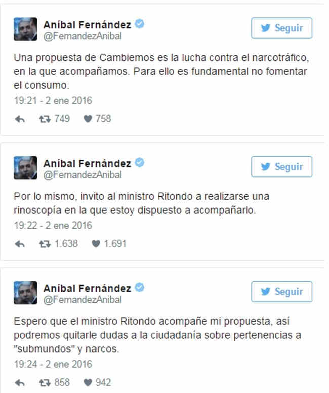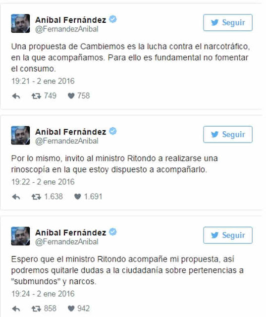 «Una propuesta de Cambiemos es la lucha contra el narcotráfico, en la que acompañamos. Para ello es fundamental no fomentar el consumo», tuiteó el ex jefe de gabinete de Cristina Kirchner y disparó: «Por lo mismo, invito al ministro Ritondo a realizarse una rinoscopía en la que estoy dispuesto a acompañarlo».