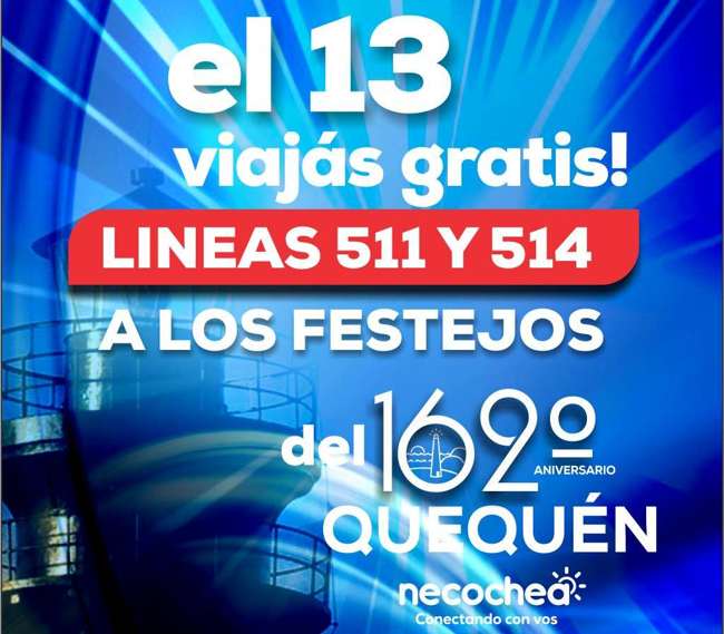 Teniendo en cuenta los festejos por el aniversario 162º de Quequén, que serán este sábado desde las 10 en la sede de Unicén en calle 508 Nº 881, la Dirección General de Transporte, por gestiones del intendente Facundo López, ha acordado con la empresa Compañía de Transportes Necochea S.A. (colectivos azules) trasladar de manera gratuita a los pasajeros que se dirijan a los festejos.
