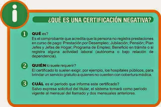 La ANSES recuerda que la Certificación Negativa es un comprobante que acredita que la persona no está cobrando prestaciones en la ANSES: Prestación por Desempleo; Jubilación; Pensión; Plan Jefes y Jefas de Hogar; Programa de Empleo; alguna prestación en trámite o si registra alguna actividad laboral (autónoma o bajo relación de dependencia).