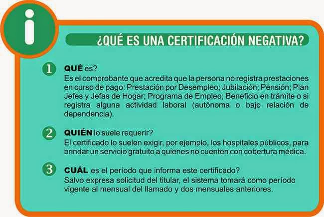 La ANSES recuerda que la Certificación Negativa es un comprobante que acredita que la persona no está cobrando prestaciones en la ANSES: Prestación por Desempleo; Jubilación; Pensión; Plan Jefes y Jefas de Hogar; Programa de Empleo; alguna prestación en trámite o si registra alguna actividad laboral (autónoma o bajo relación de dependencia).