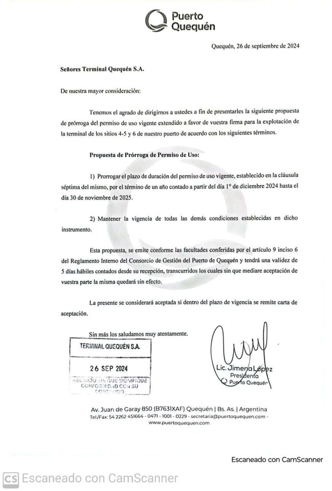 En un contexto marcado por la necesidad de certidumbre para el sector agroexportador, la Presidenta del Consorcio de Gestión del Puerto de Quequén, Lic. Jimena López, anunció ante los medios la prórroga del permiso de uso de la Terminal Quequén. El acuerdo, que tendrá vigencia por un año bajo las mismas condiciones actuales, garantiza la continuidad de las operaciones en los sitios 4, 5 y 6, asegurando además los empleos de las cien familias que dependen de esta actividad.