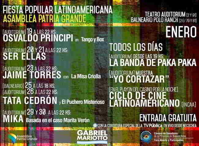 El presidente del Senado, Gabriel Mariotto, continúa fomentando en la provincia de Buenos Aires jornadas latinoamericanas de integración cultural, política y social. Luego de la exitosa Asamblea Patria Grande realizada entre el 10 y 13 de octubre del año pasado en el Centro Cultural Islas Malvinas de La Plata, la Fiesta Popular arriba a la ciudad de Necochea.