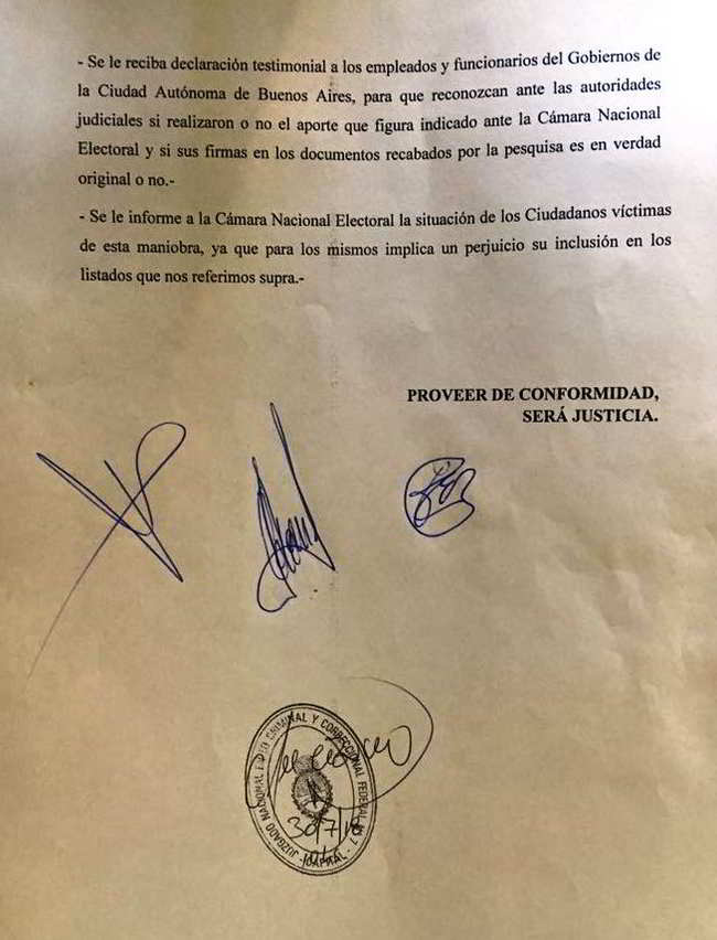 Rattoni, otra de las integrantes de la fundación, adelantó que pedirán a Casanello y a Stornelli “convocar como testigos a los funcionarios porteños y empleados. En esa figura no pueden mentir porque serían imputados por falsos testimonios. Todas las personas que pedimos sean convocadas deberán verificar su firma y el aporte que figura hoy en la Cámara Nacional Electoral”.