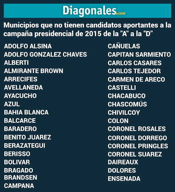 Este medio contó que en 82 de los 135 municipios, las listas completas de los candidatos de Cambiemos figuran donando dinero a la campaña presidencial de Mauricio Macri. Un dato por demás llamativo se desprende del análisis de los municipios que no tienen representantes que figuren como aportantes.