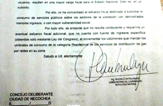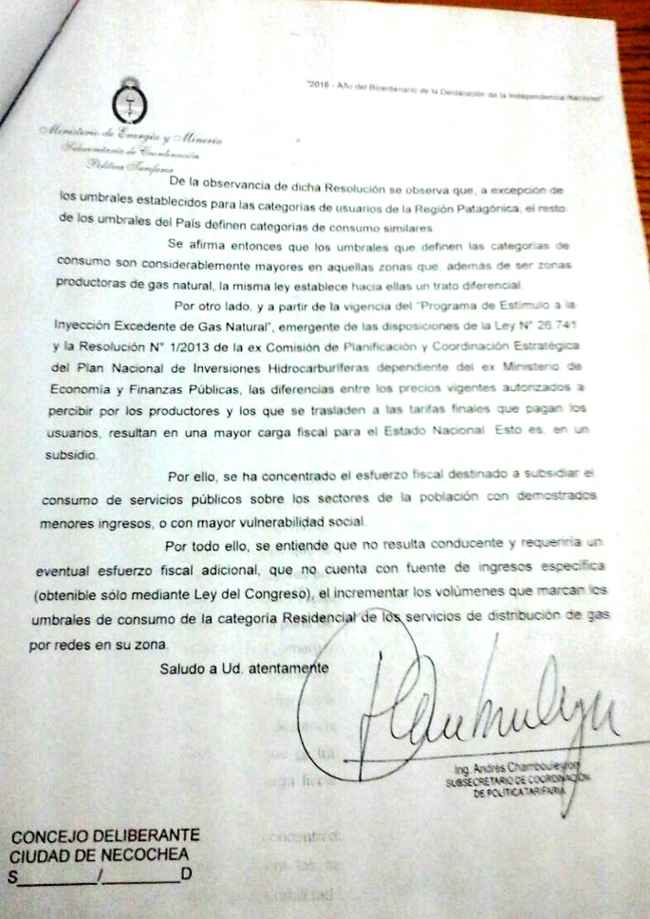 En la misiva se hace referencia a normativas nacionales de segmentación de tarifas residenciales (R1, R2, R3) así como los requisitos para ser considerados dentro de la denominada «Región Patagónica». Allí se hace mención también a los umbrales de consumo (Necochea tendría cifras similares a otras zonas del país) y al por qué de los beneficios otorgados a las zonas productoras de gas natural (que no es el caso de nuestro distrito).