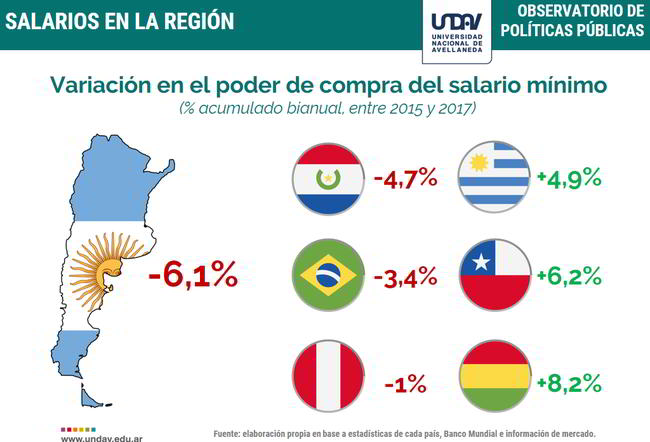 Los números obtenidos muestran que sólo cuatro de los siete países verificaron un deterioro de poder adquisitivo en el período estudiado. En el detalle, tanto Argentina (-7,2%) como Brasil (-4,7%), Paraguay (-4,3%) y Perú (-2,9%) presentaron un descenso de la capacidad de compra del salario mínimo entre el período 2015 y 2016.
