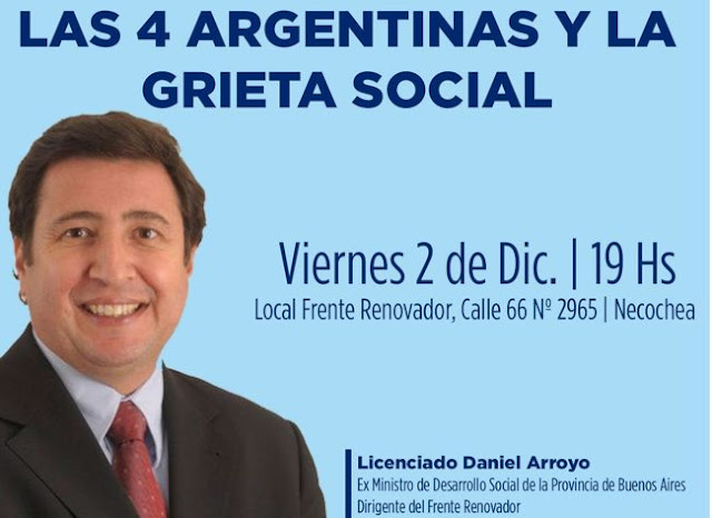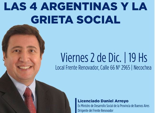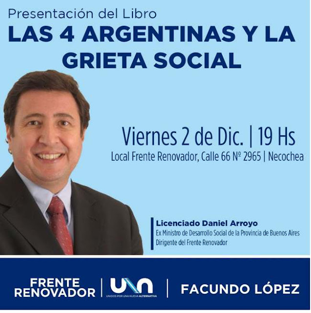 El líder del Frente Renovador Necochea e Intendente local, Dr. Facundo López, recibirá este viernes al Lic. Daniel Arroyo quien presentará el libro “Las 4 Argentinas y la grieta social, propuestas para una nación integrada” a las 19hs. en el local partidario ubicado en Calle 66, N° 2965. La entrada es libre y gratuita a toda la comunidad.