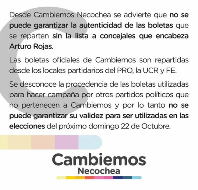 A su vez, en las últimas horas impulsaron un comunicado para evitar el éxodo de votantes: «Desde Cambiemos Necochea se advierte que no se puede garantizar la autenticidad de las boletas que se reparten sin la lista a concejales que encabeza Arturo Rojas. Las boletas oficiales de Cambiemos son repartidas desde los locales partidarios del PRO, la UCR y FE. Se desconoce la procedencia de las boletas utilizadas para hacer campaña por otros partidos políticos que no pertenecen a Cambiemos y por lo tanto no se puede garantizar su validez para ser utilizadas en las elecciones del próximo domingo 22 de octubre».