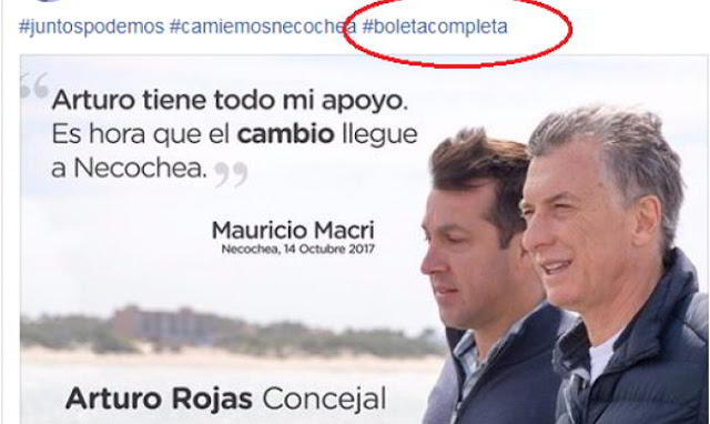 Desde un comunicado públicao, pasando por la campaña visual hasta la intervención en las redes sociales, la militancia macrista da cuenta del principal temor que azota a Rojas en las últimas semanas.“#juntospodemos #camiemosnecochea #boletacompleta”, son los hashtag impulsados por el mismísimo candidato en su cuenta de Facebook y replicados por gran parte de la militancia orgánica. “No cortes la boleta como quieren que hagas, para poder sobrevivir y no sentir la desaprobación de la gente a una mala gestión”, agrega uno de sus seguidores en el muro el candidato.