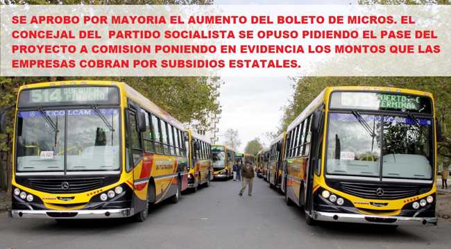 En la 14° Sesion Ordinaria en el Honorable Concejo Deliberante de Necochea, en la misma se trato la suba del boleto de micros, la que fue aprobada por mayoría (Frente para la Victoria, Cambiemos FE, Cambiemos PRO y Frente Renovador) . El concejal del Partido Socialista Mario La Battaglia planteo en la sala el pase a comisión de la suba del boleto, ya que se había acompañado una escueta información de costos de las empresas de micros para justificar el aumento del mismo, pero no se había acompañado la rendición de los subsidios que perciben las mencionadas empresas, ello sumado a los reclamos de vecinos que le manifestaron al concejal socialista como ser el cambio de frecuencia, recorrido, supresión de alguno de los recorridos en forma arbitria por las empresas de transporte motivaron el pedido del pase a comisión del expte en cuestión por parte de La Battaglia.