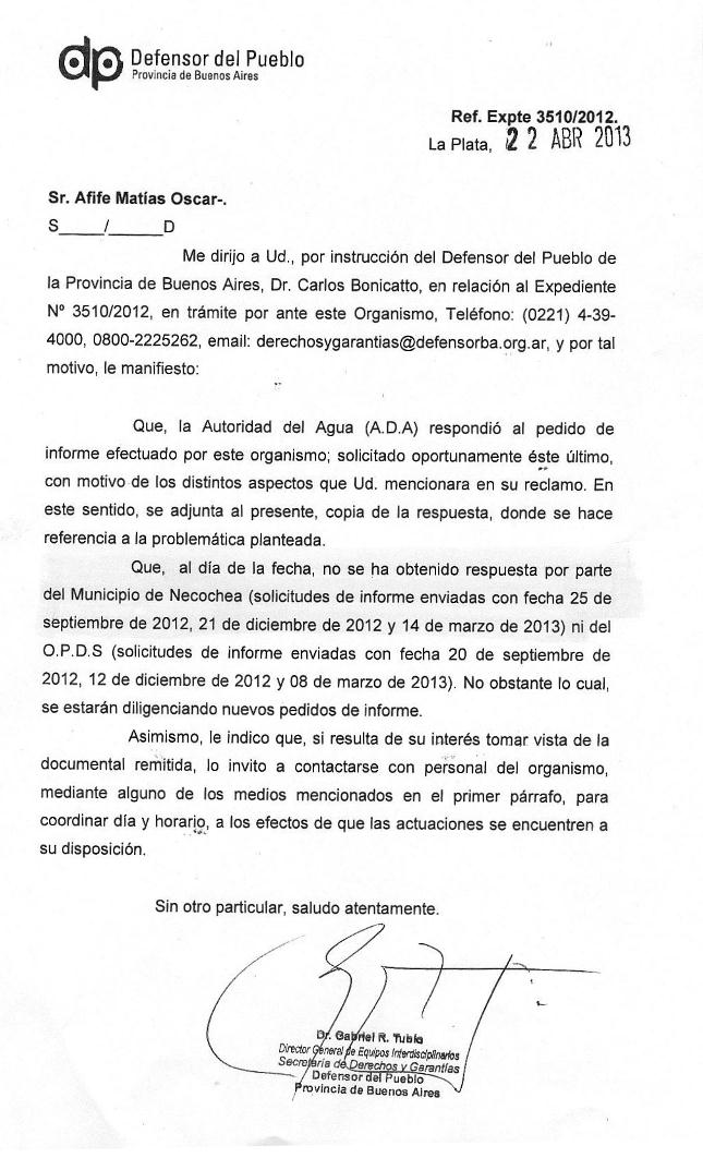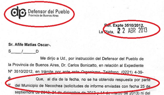 El texto de la comunicación enviada por la Defensoría señala que «al día de la fecha (el documento está fechado el 22 de abril de 2013) no se ha obtenido respuesta por parte del Municipio de Necochea (solicitudes de informe enviadas con fecha 25 de septiembre de 2012, 21 de diciembre de 2012 y 14 de marzo de 2013) ni del O.P.D.S. (solicitudes de informe enviadas con fecha 20 de septiembre de 2021, 12 de diciembre de 2012 y 8 de marzo de 2013).