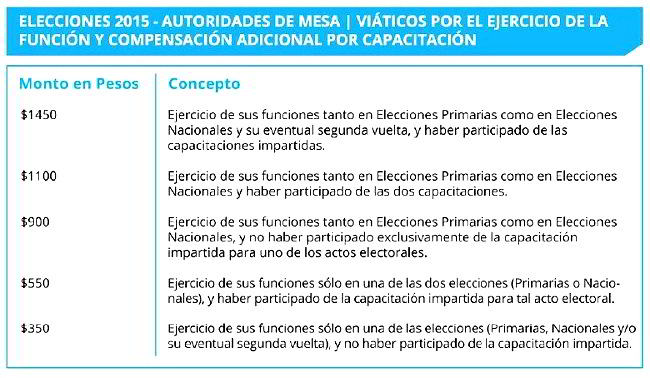 El tercero, por $ 900, es para los que cumplan como autoridades en las PASO y en las generales pero hayan asistido a una sola de las capacitaciones.