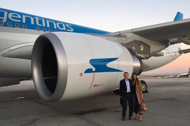 El depto de marketing PRO elige fotografiar a Macri y esposa al pie de un avión de Aerolíneas Argentinas en España, en el momento que sale a la luz su interés por desguasar la empresa y adjudicar sus rutas aéreas a Avianca, empresa de Macri.