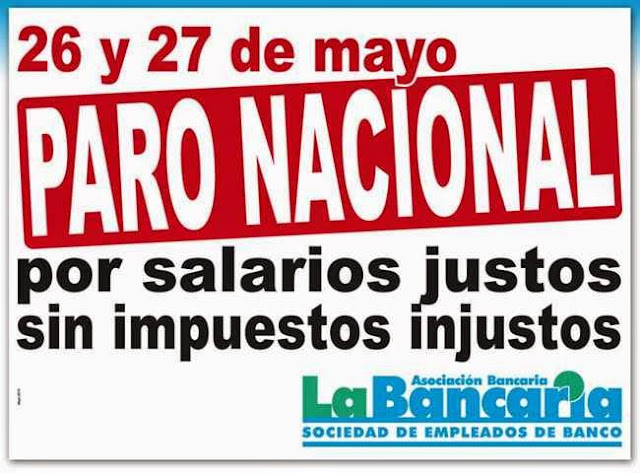 Bajo el lema «salarios justos sin impuestos injustos», el gremio bancario anunció un paro nacional de actividades para los días 26 y 27 de Mayo de 2015.