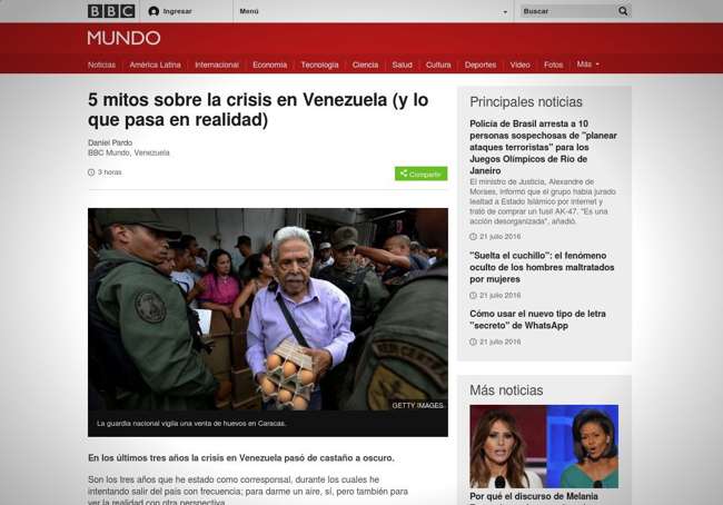 Con un artículo titulado “5 mitos sobre la crisis en Venezuela (y lo que pasa en realidad)”, la BBC, un medio que tradicionalmente ha sido bastante crítico al gobierno del presidente Nicolás Maduro, reconoce que hay “impresiones exageradas” en la percepción que tienen habitantes de numerosos países sobre la situación que ocurre en Venezuela