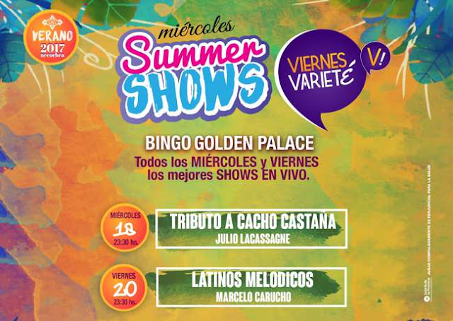 Summer Shows es el ciclo de shows en vivo que todos los miércoles se suma a la lista de propuestas que Bingo Golden Palace pensó para vos. Fabulosas promos con premios en efectivo, Viernes varieté con shows en vivo, el divertidísimo Bingo cartón y el mejor servicio en máquinas tragamonedas y ruletas electrónicas.