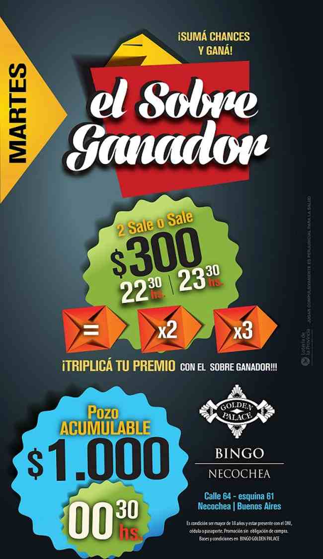 Todos los Martes en Bingo Golden Palace ubicado en calle 61 esquina 64 de Necochea, el público puede disfrutar de una variedad de promociones especiales y premios acumulados, con entrada general sin cargo para mayores de 18 años.
