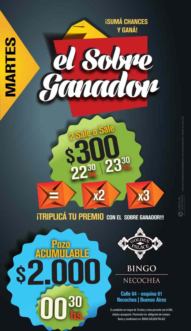 HOY, martes 20 de Octubre desde las 22.30hs, Bingo Golden Palace contará con una nueva noche de sorteos de la promoción el “Sobre Ganador” donde se pondrá en juego más de $3.500 en efectivo, entre sorteos modalidad “sale o sale” y “acumulable”.