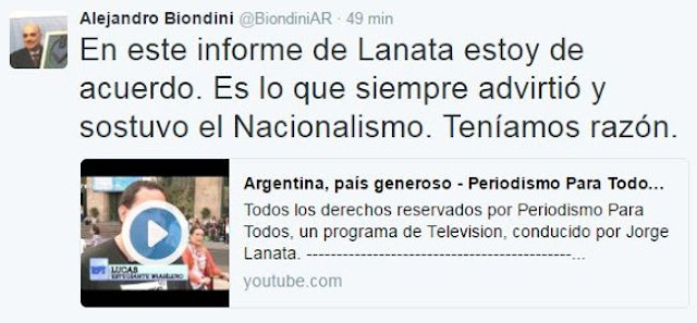«En este informe de Lanata estoy de acuerdo. Es lo que siempre advirtió y sostuvo el Nacionalismo. Teníamos razón», dijo Biondini en un tuit.