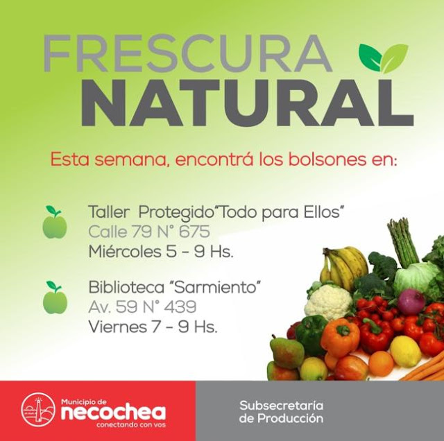 Frescura Natural comercializará sus bolsones, compuestos por 19 productos, en la sede del Taller Protegido “Todo para Ellos”, el miércoles 5; y en la Biblioteca Popular “Sarmiento”, el viernes 7.
