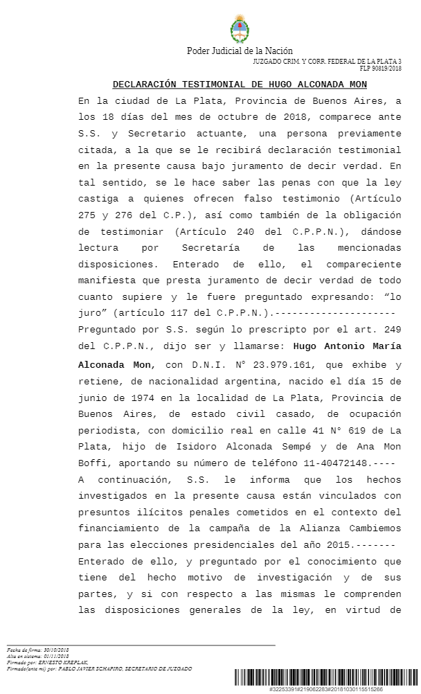 El periodista Hugo Alconada Mon declaró ante el juez Ernesto Kreplak en la causa por los aportes truchos de Cambiemos y dio detalles del dinero negro, el uso de cuevas financieras, y el transporte de fortunas en aviones y camiones para financiar la campaña.