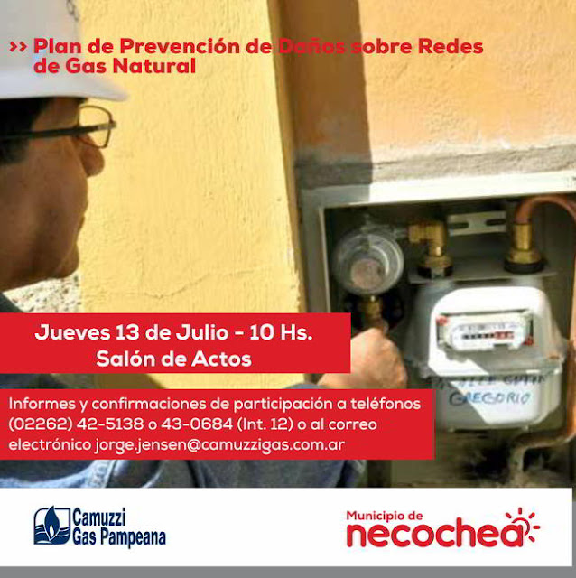 Con el objetivo de difundir recomendaciones y medidas preventivas, la Secretaría de Planeamiento, Obras y Servicios Públicos de la Municipalidad de Necochea en conjunto con la empresa Camuzzi Gas Pampeana S.A., se encuentran organizando para este jueves 13 una charla informativa sobre el Plan de Prevención de Daños (PPD) sobre Redes de Gas Natural.