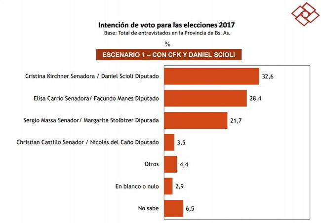 En el primer escenario presentado por la consultora, con Cristina Kirchner como candidata a senadora y Daniel Scioli como primer candidato a diputado, el FpV iría al frente con 32,6% sobre el dúo Elisa Carrió-Facundo Manes con 28,4% por Cambiemos, mientras que Sergio Massa y Margarita Stolbizer alcanzaría 21,7%.