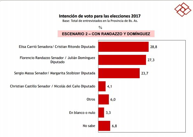 En tanto en el segundo escenario, Carrió junto a Cristian Ritondo por Cambiemos aparecen vencedores con 28,8% por encima de Florencio Randazzo y Julián Domínguez por el FpV 27,3%, mientras que Massa y Stolbizer se acercan con 23,7%.