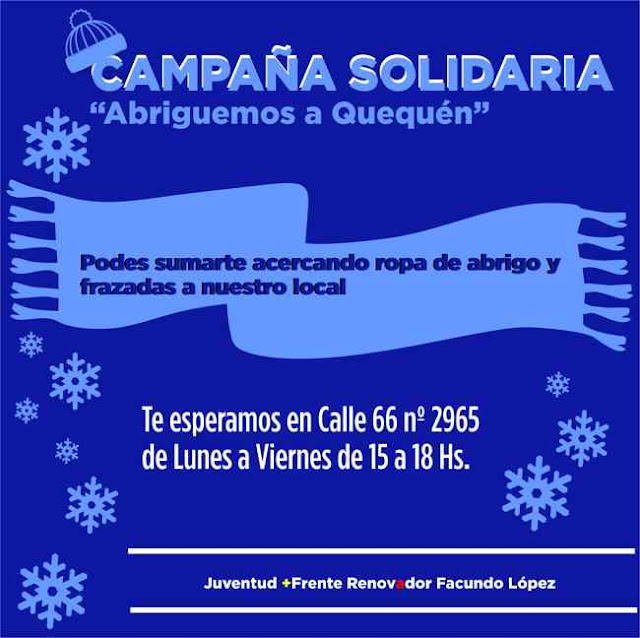 Desde la Juventud del Frente Renovador Necochea, se comenzó una campaña para que vecinos del Distrito acerquen donaciones de ropa de abrigo y frazadas para las zonas más afectadas de Quequen por la ola de frio de estas últimas semanas y las venideras.