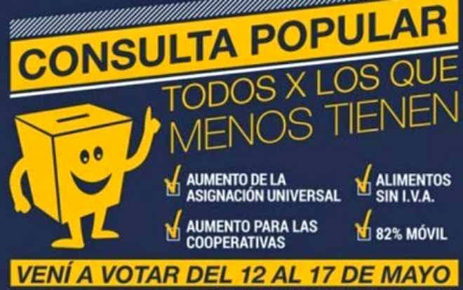 La Consulta Popular discutirá en torno a los ejes: Asignación Universal por Hijo; Programas de Empleo, Capacitación y de Cooperativas; 82% móvil para los jubilados; y eliminación del IVA a los alimentos de la canasta básica para los que menos tienen.