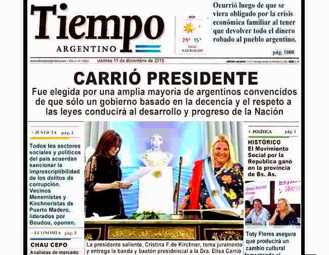 La diputada Elisa Carrió también imaginó su propia tapa como presidenta. Pero en este caso no fue la de Clarín, si no la de Tiempo Argentino. Así parodió a La Cámpora y publicó «su propia noticia» en la portada del diario oficialista. «Carrió presidente», dice el título de tapa que también tiene fecha del 11 de diciembre de 2015.