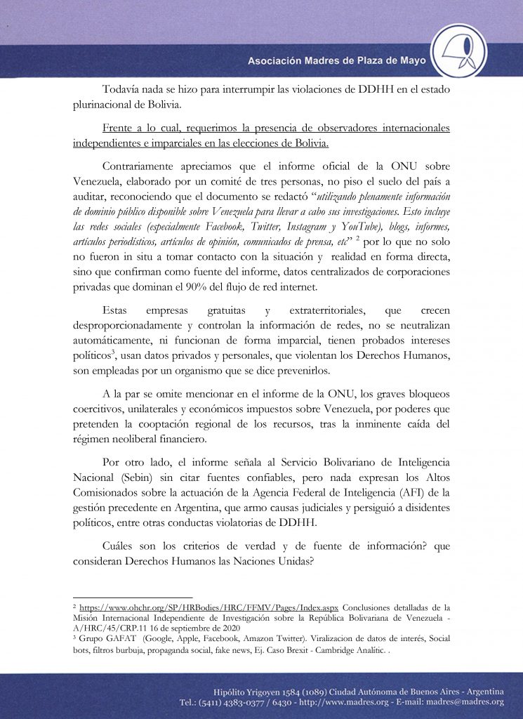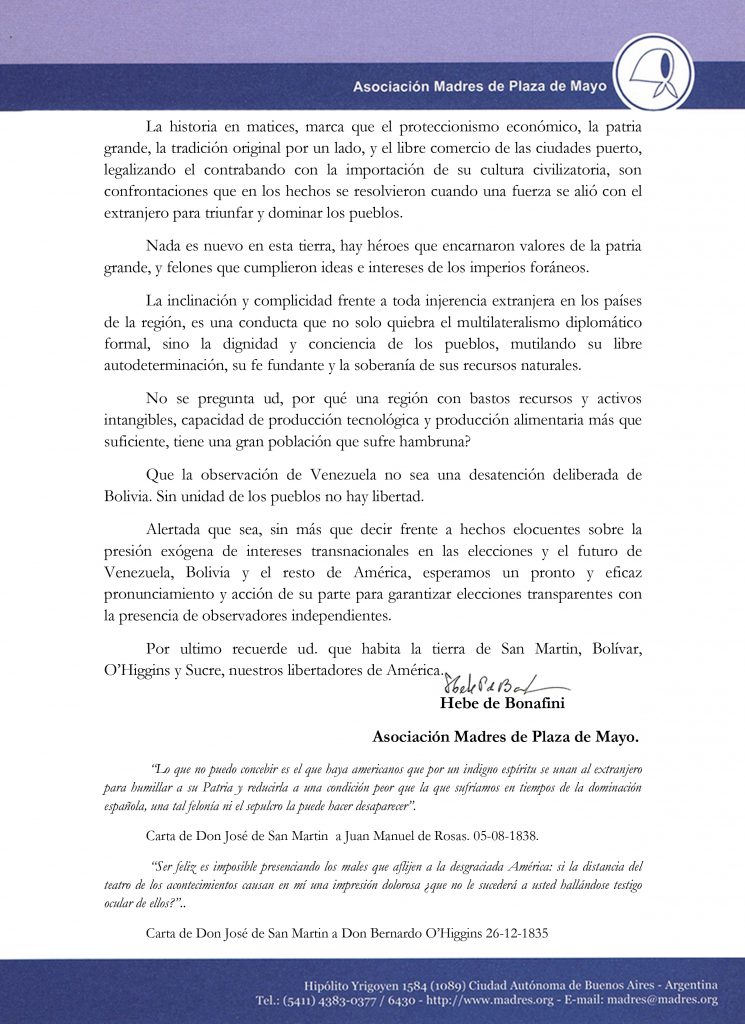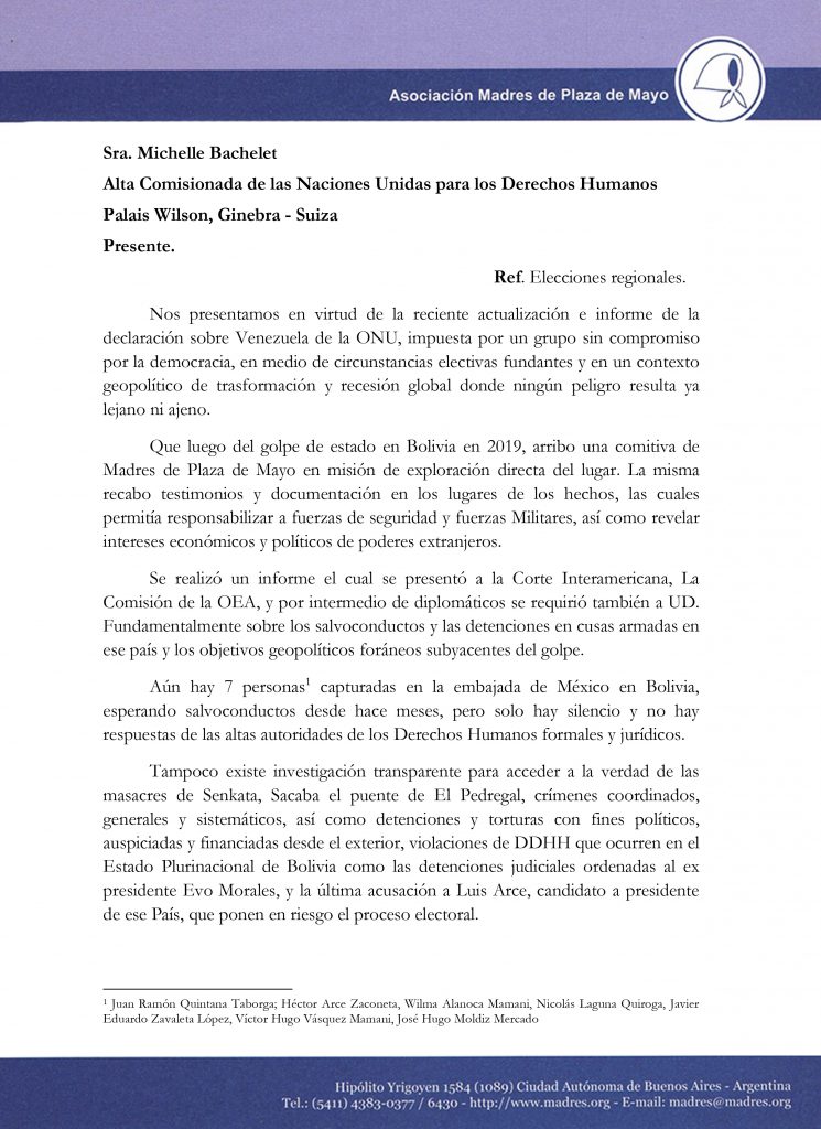 Las Madres de Plaza de Mayo solicitaron a la ONU mediante la Alta comisionada M. Bachelet la transparencia en las elecciones de Bolivia y Venezuela, además exigieron la presencia de observadores independientes e imparciales.