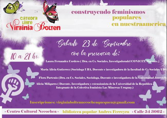 El sábado 23 de septiembre a partir de las 9 hs se llevará a cabo en el Centro Cultural Necochea una charla taller de LA BOLTEN ITINERANTE promovida por la Cátedra Libre Virginia Bolten.