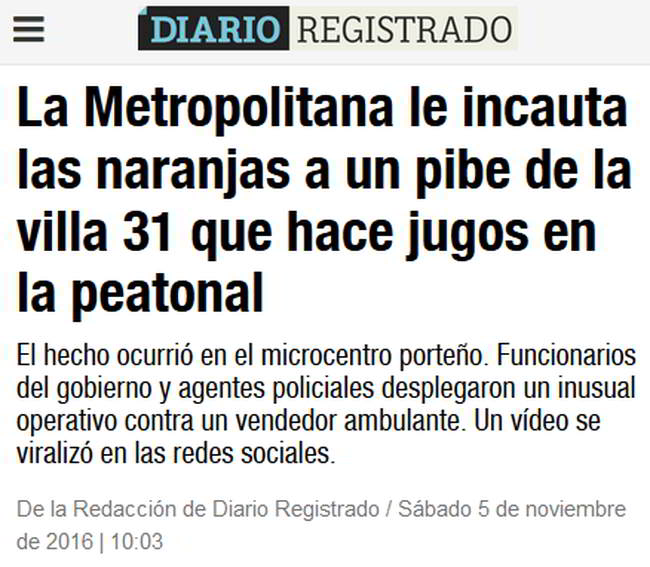 La Ministra Stanley olvidó avisarle a Juán que Cambiemos no comparte la venta ambulante, y como ejemplo podemos recordar cuando la Policía Metropolitana de Larreta le incautó las naranjas a un chico de la Villa 31 que subsistía vendiendo jugo en la peatonal. En esa oportunidad una horda de uniformados despojaron al joven de su changa ante la atónita mirada de los transeuntes que les pedían a los uniformados que por favor lo dejaran trabajar.
