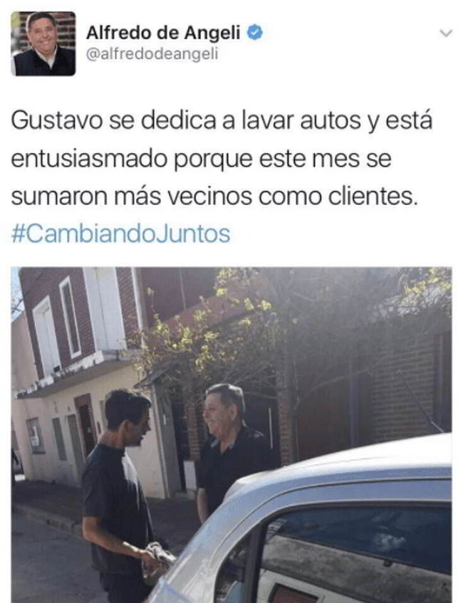 Alfredo de Angeli fue otro de los festejantes de la changa. El senador subió a su cuenta el caso de “Gustavo” quien se dedica a “lavar autos” en la puerta de su casa y “está entusiasmado porque este mes se sumaron más vecinos como clientes“. Alfredo no comenta de que trabajaba “Gustavo” antes de volverse trapito en la puerta de su casa, pero si tiene auto claramente tenía un trabajo con el que ya no cuenta, y los vecinos que antes iban al lavadero de autos, ahora solo pueden tirarle unas monedas a Gustavo.